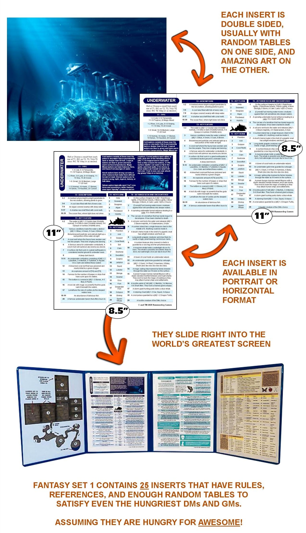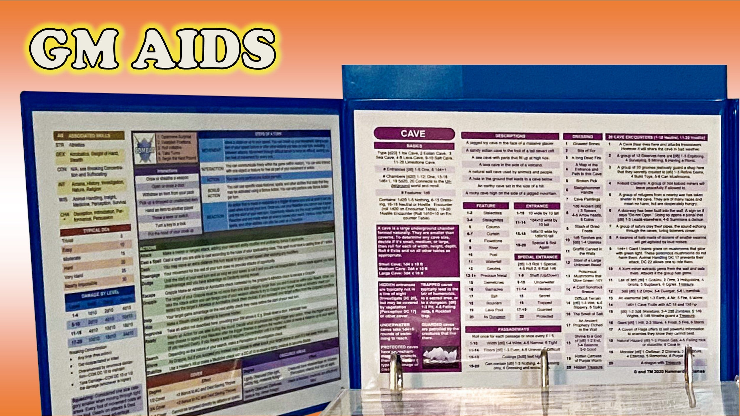 Charts, tables, random generators, party trackers and more. Inserts are available by system and for some Hammerdog adventures.