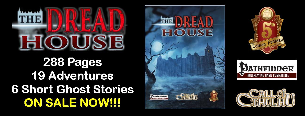 Welcome to the Dread House, a haunted house setting that contains 19 chilling adventures compatible with DnD 5th edition, Pathfinder 1st edition, and Call of Cthulhu. The adventures can be played separately, or combined to create a campaign that transcends time and place.